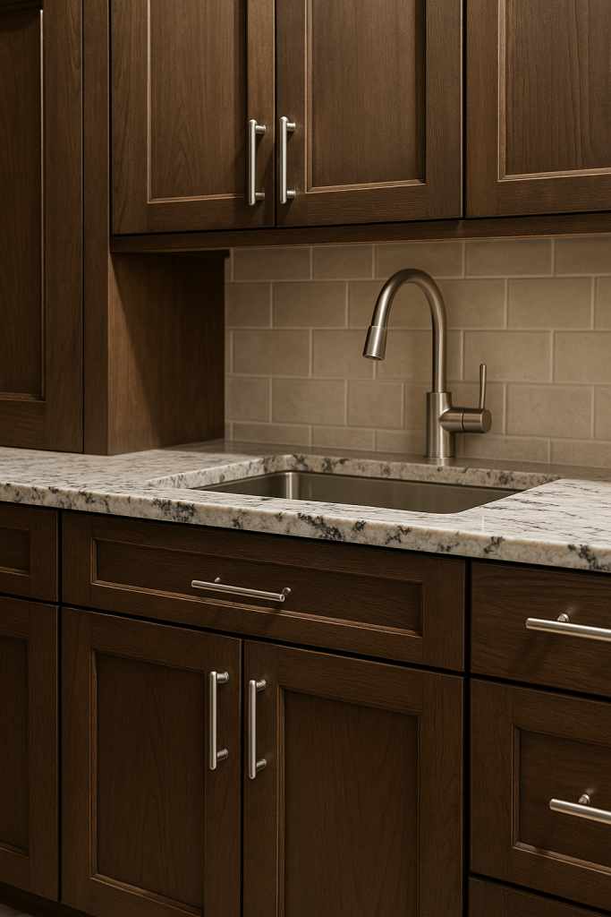 The best cabinetry for humid climates like Marietta uses plywood cabinet boxes combined with moisture-resistant MDF (MR-MDF) doors and panels. Plywood is naturally more stable than particleboard and resists warping. MR-MDF resists swelling and holds paint finishes better. Look for cabinets with sealed edges, factory-cured finishes, and soft-close hardware engineered for high humidity. Investing in quality cabinetry significantly extends your kitchen’s lifespan.